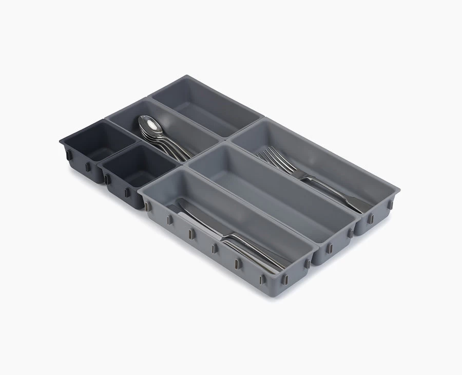 This drawer storage solution includes seven individual trays of different sizes that are able to be clipped together on all sides, allowing you to arrange them in any order to fit your drawer space.