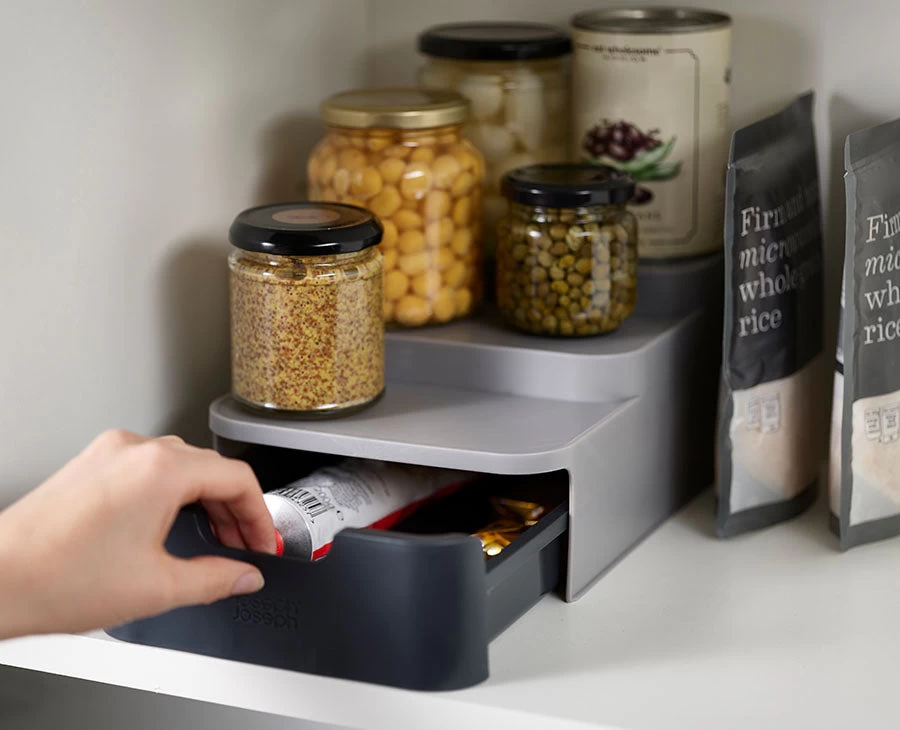 - Drawer is perfect for storing small items such as stock cubes, packets or bags