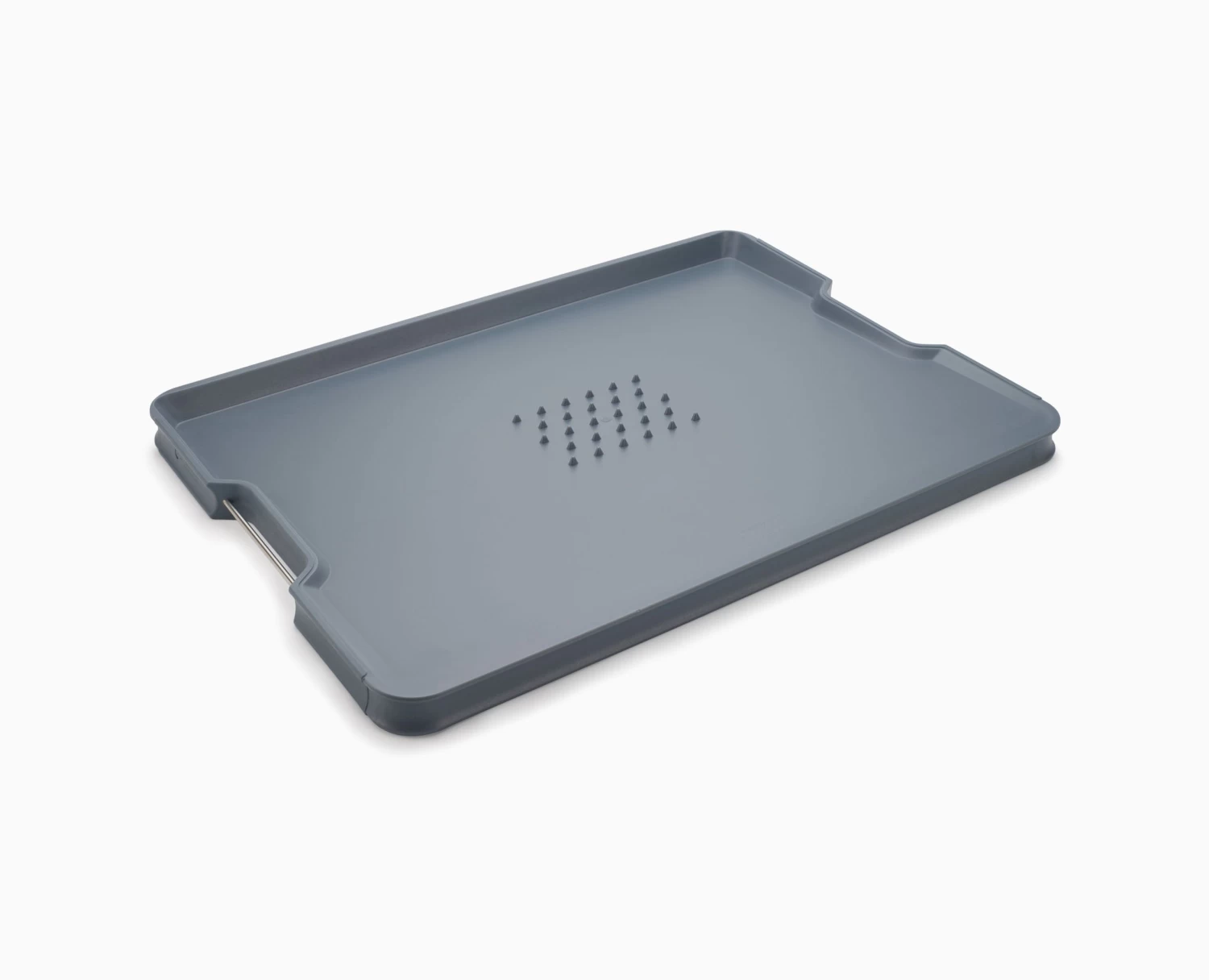 - Unique sloping base and raised edges help catch crumbs and meat juices