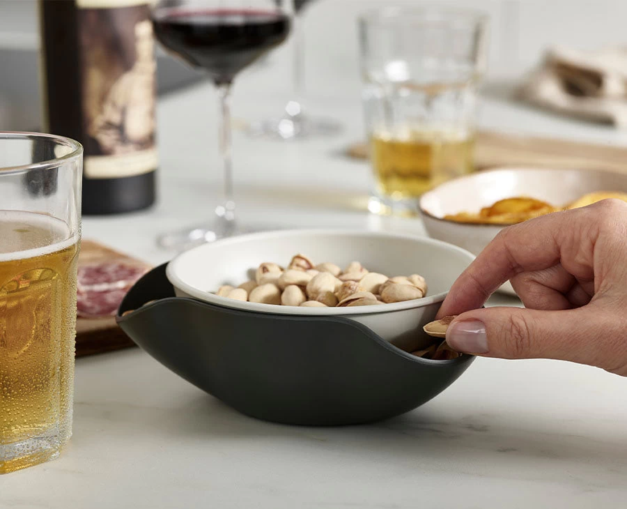 The unique design of this serving bowl is actually two bowls stacked on top of each other, with the lower one curved outwards in three places creating chutes down which food waste can be dropped.