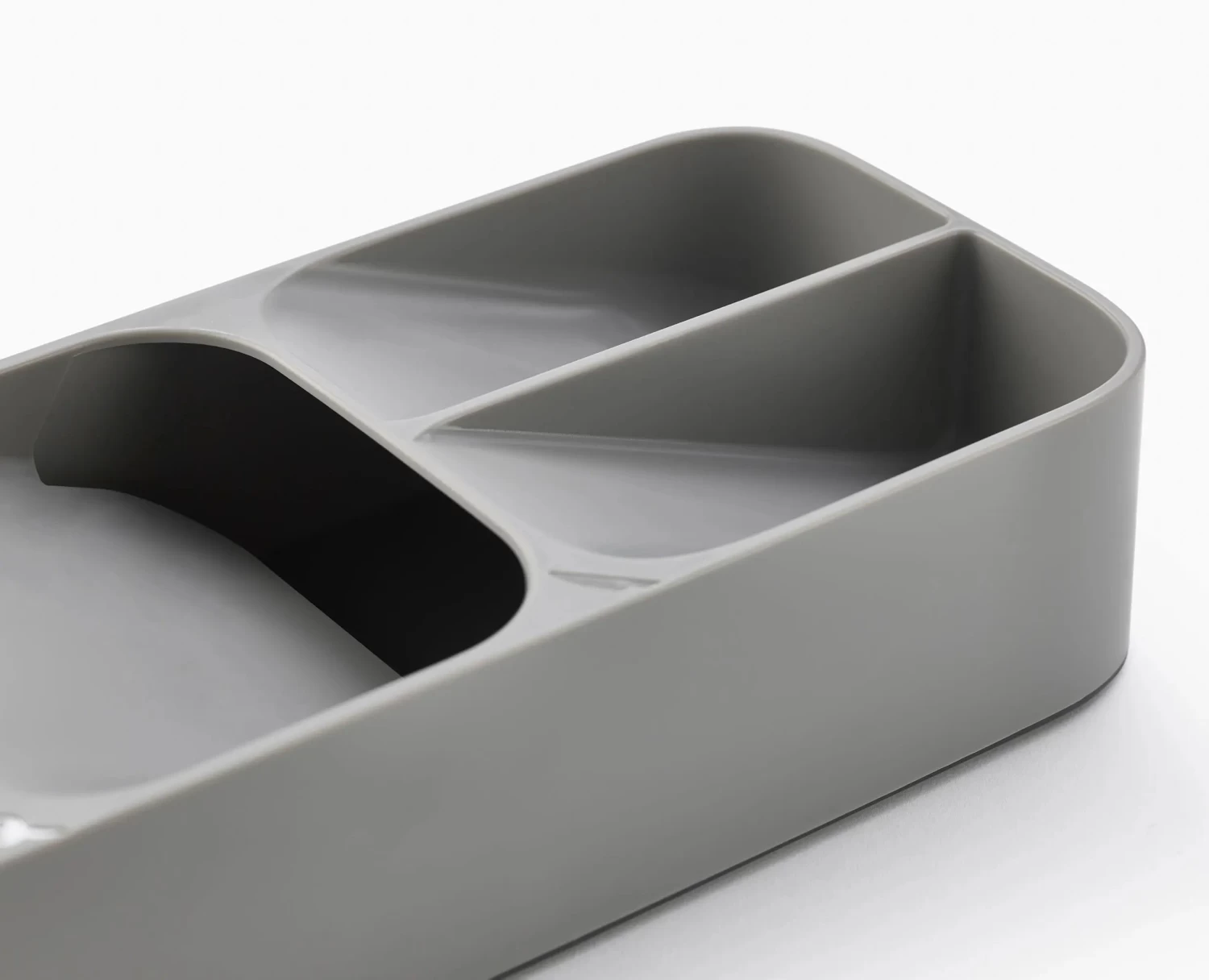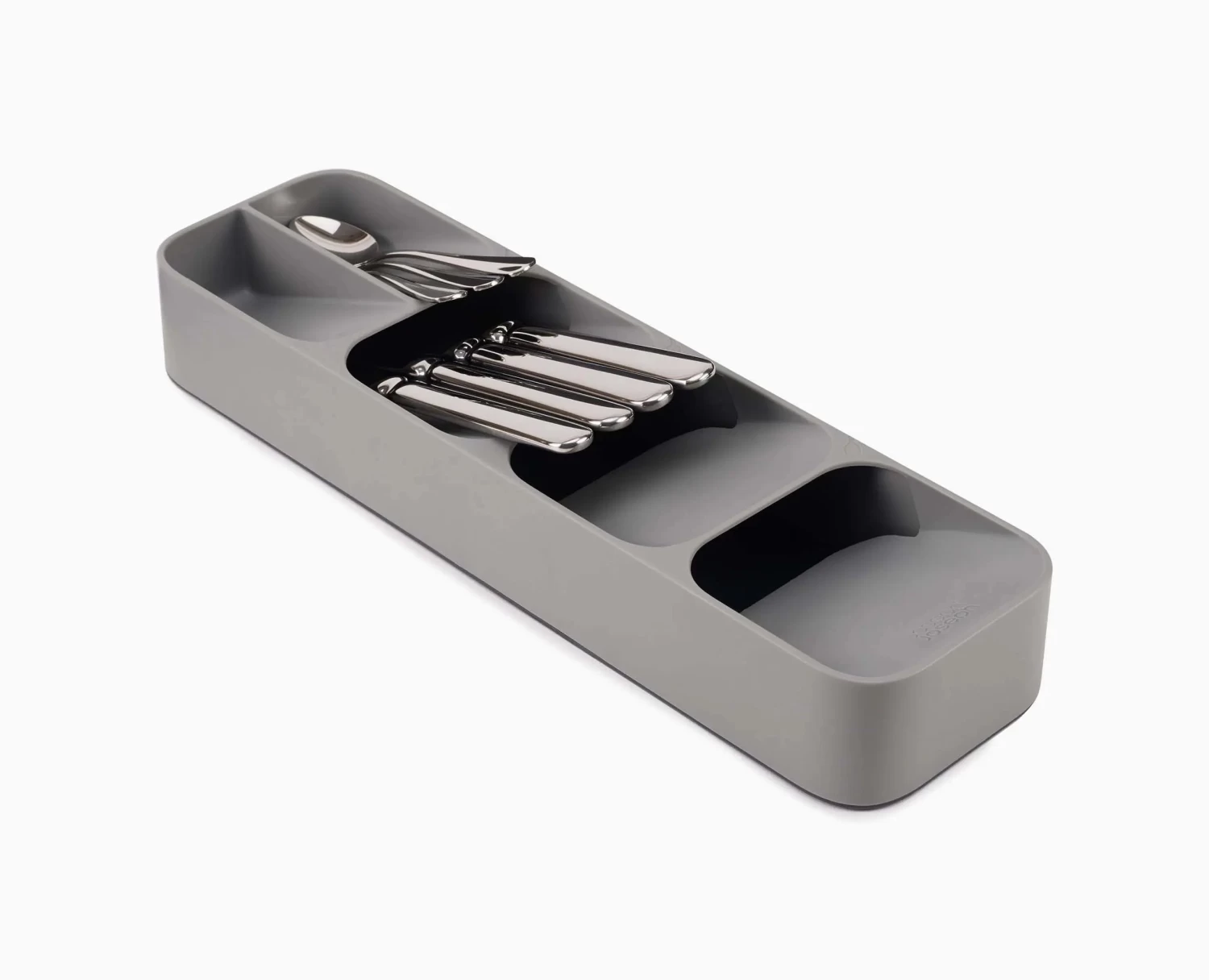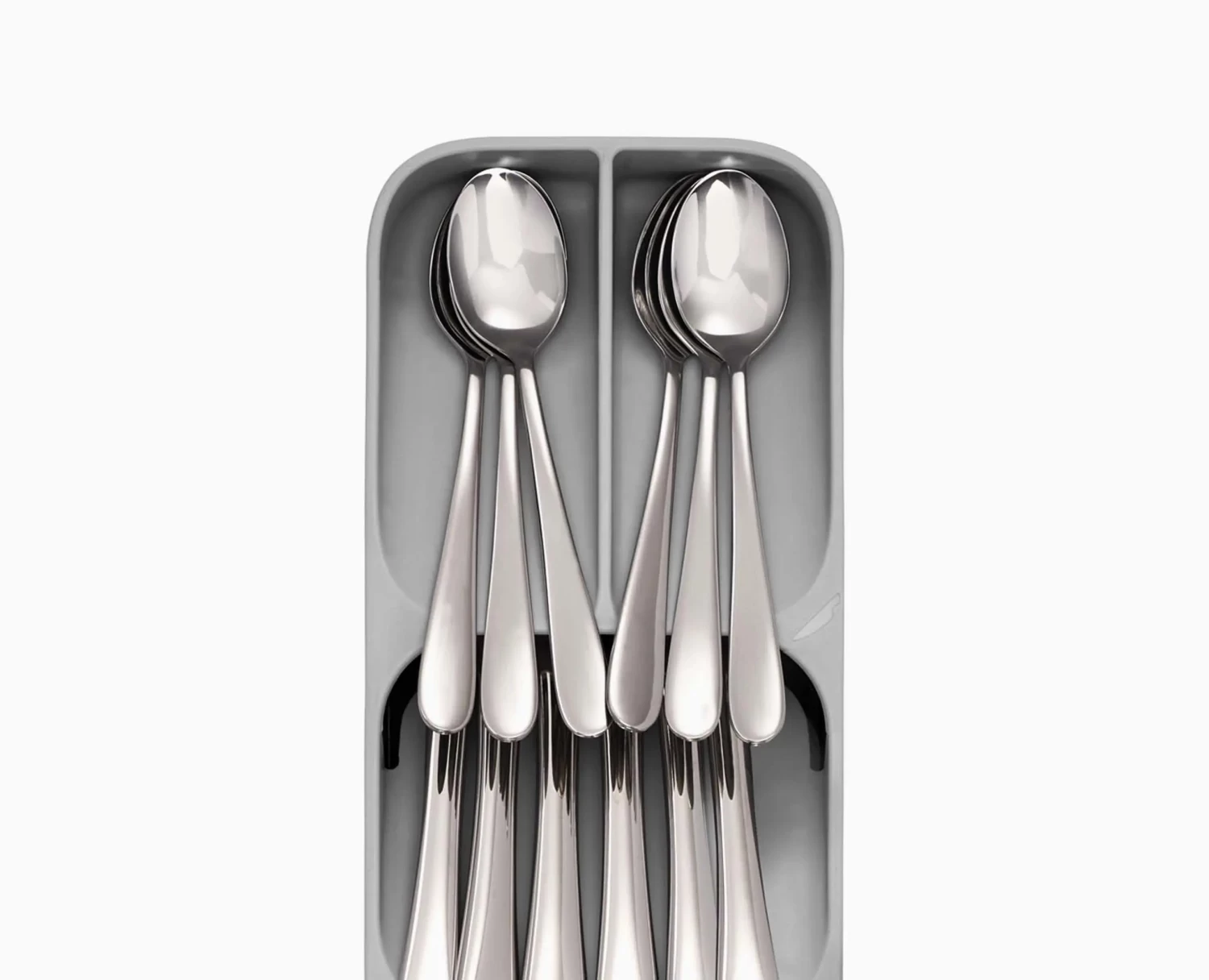 Keep your kitchen drawers in order with this compact storage solution. The unique tray features angled, over-lapping cutlery compartments that take up less room so you can combine two drawers into one.