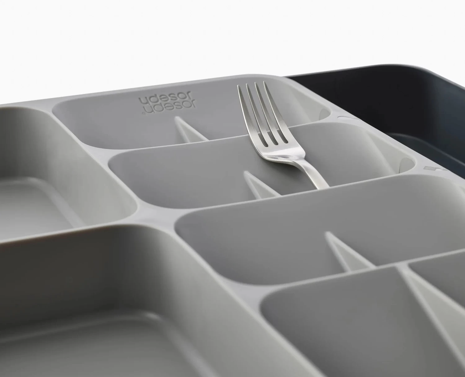 The unique design of this highly practical storage solution features five overlapping compartments for storing cutlery and two deep-sided compartments for holding gadgets so you can easily organise messy cutlery and utensil drawers.