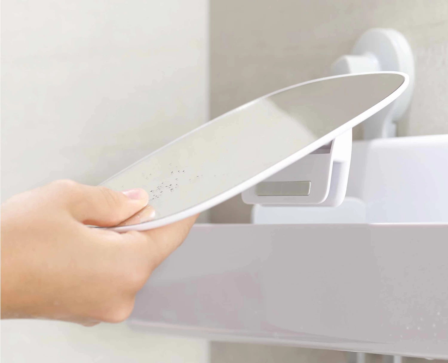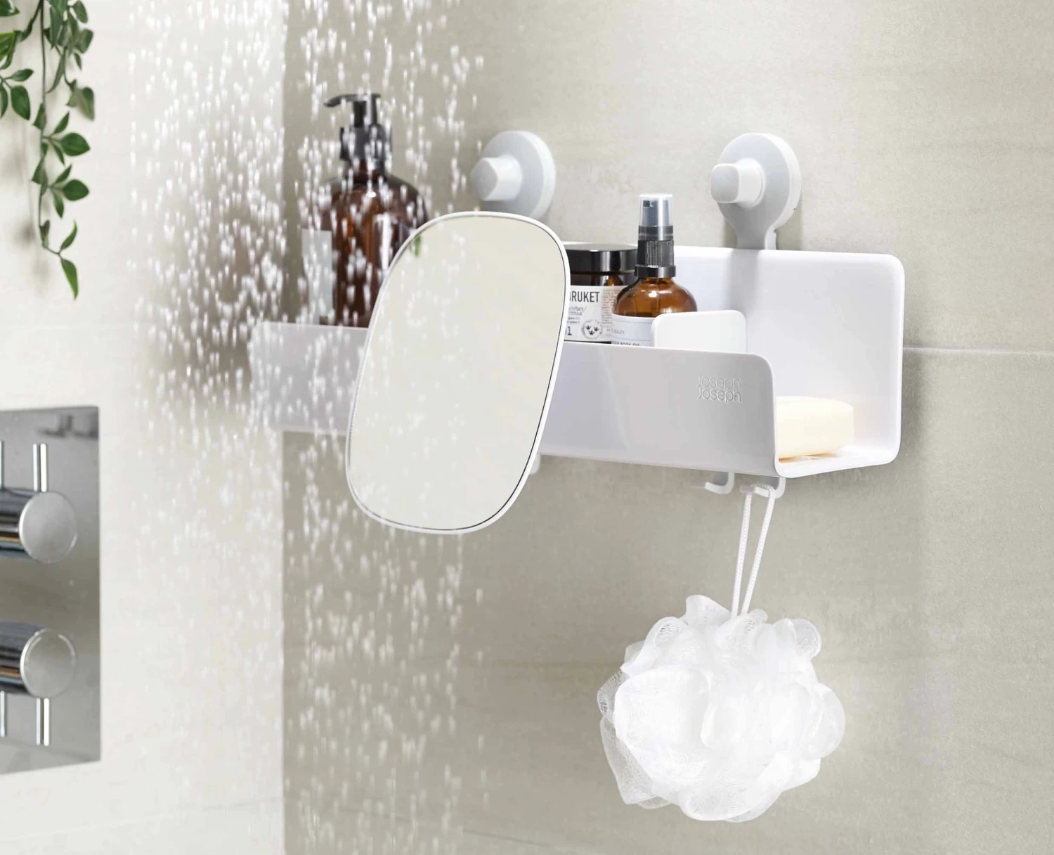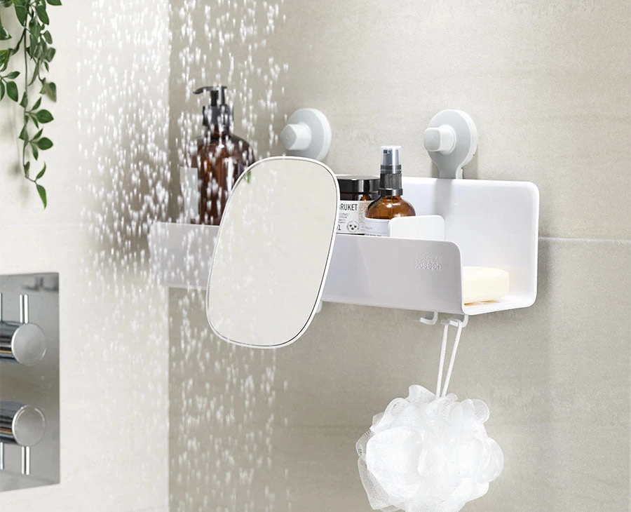 This large shower shelf takes the hassle out of shower storage by holding soap bars, shower gels and shampoo bottles and features hooks for razors, sponges and flannels and a hinged, removable, shatter-resistant acrylic mirror.