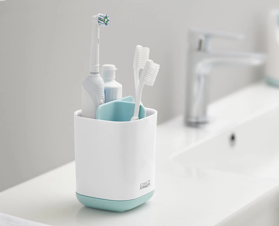 These toothbrush caddies have different sections for organising a variety of oral care items such as manual or electric toothbrushes and toothpaste tubes.