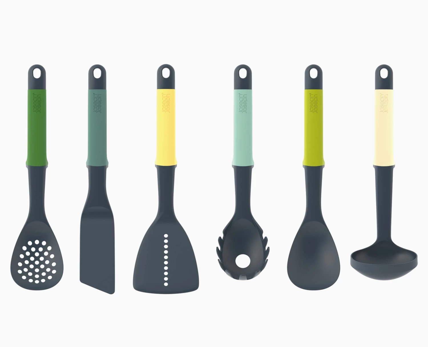 - Set includes: slotted spoon, spaghetti server, solid spoon, slotted turner, flexible turner and ladle