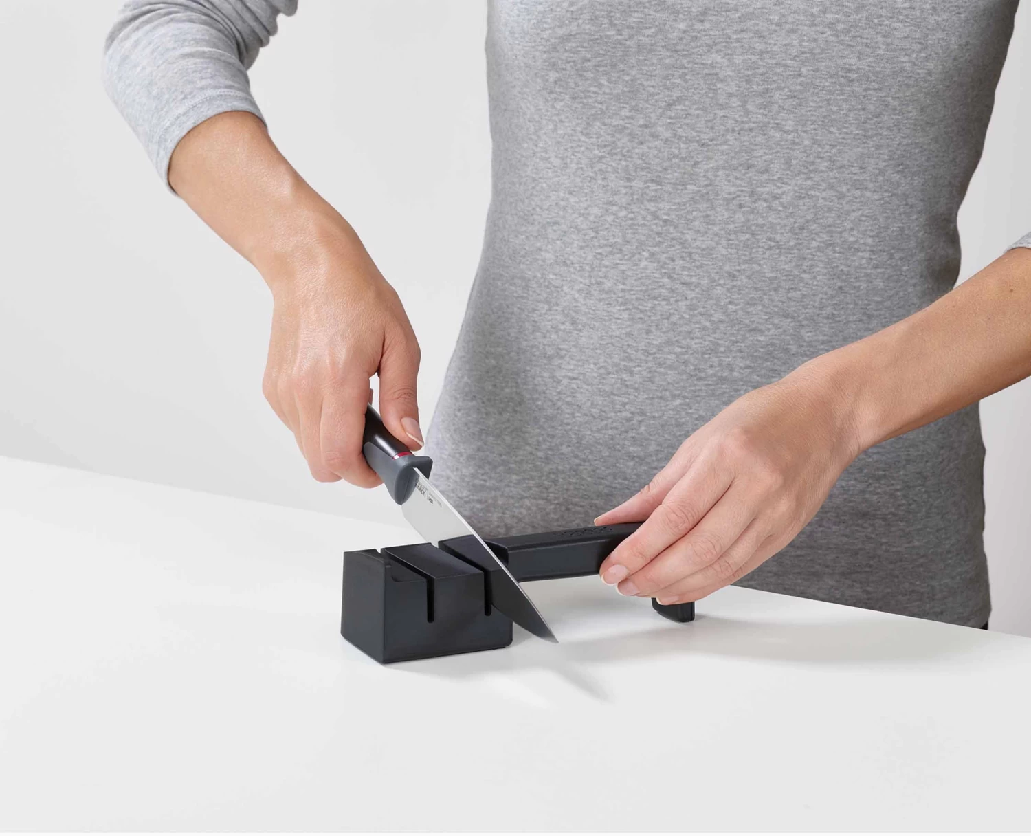 - Weighted handles and integrated knife rests prevent blades from touching the work surface when placed down