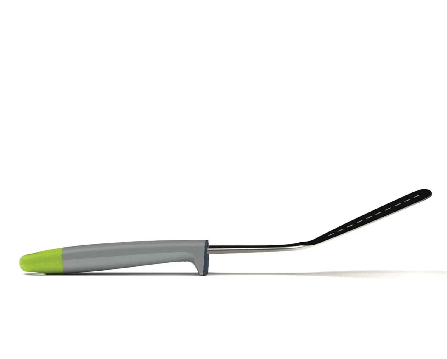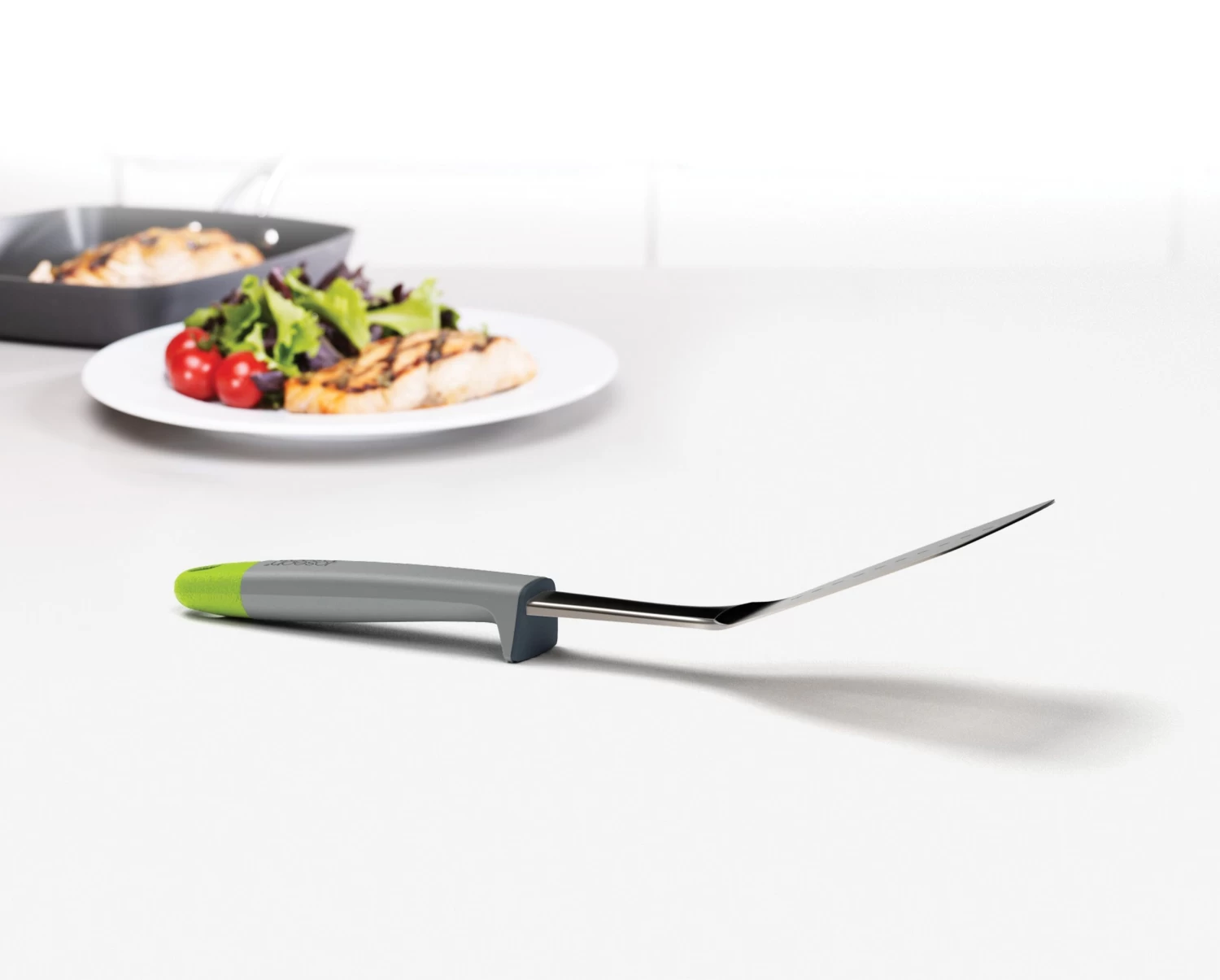 This stainless-steel slotted turner has an integrated tool rest that stops its head from touching the surface its placed down on.