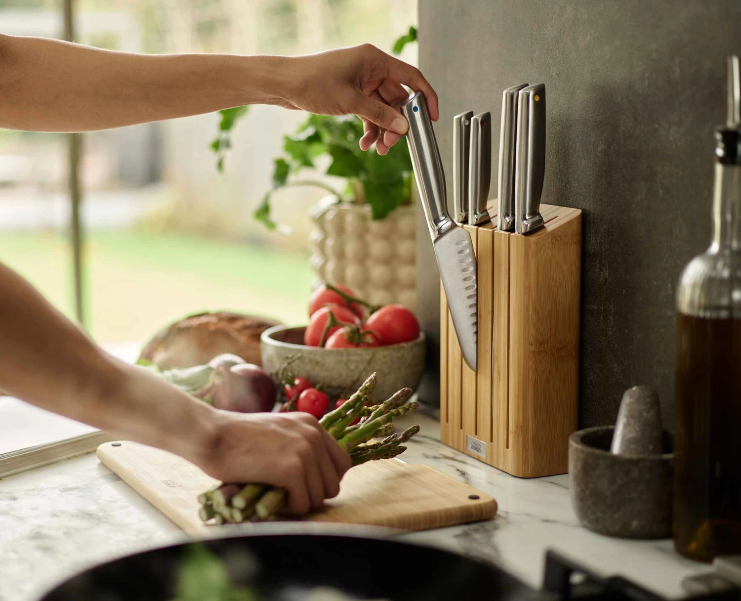 - Set includes 3.5″ (9 cm) paring knife, 4.5″ (11 cm) serrated knife, 5.5″ (14 cm) santoku knife, 8″ (20 cm) chef’s knife and 8″ (20 cm) bread knife