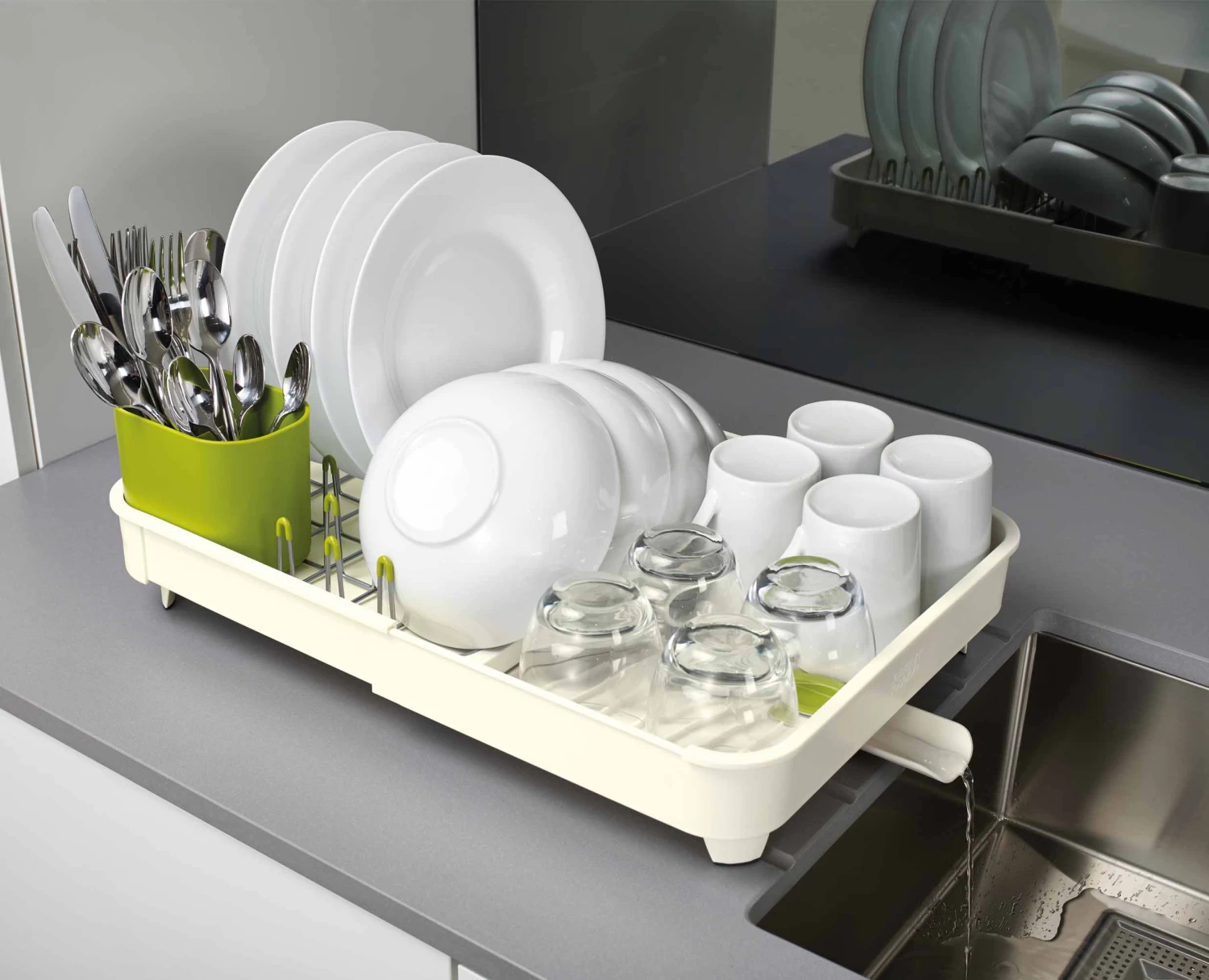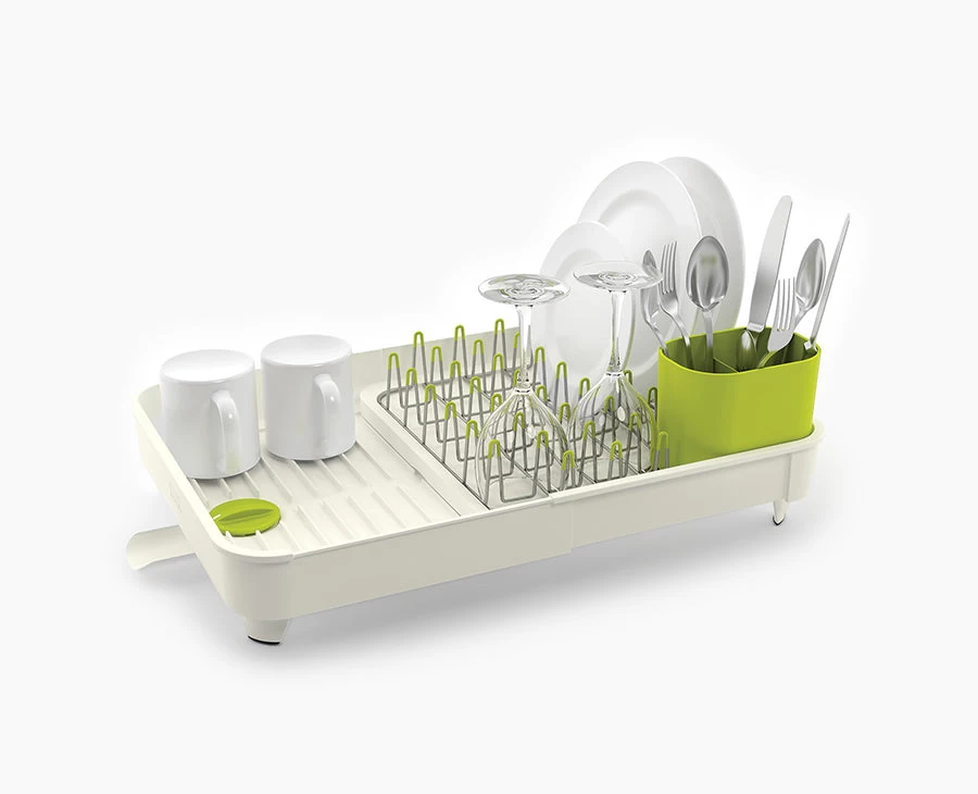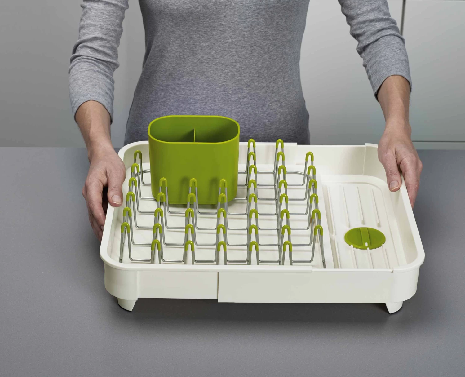 This versatile dish rack allows you to quickly and easily expand your dish drying space to almost twice its size when needed.