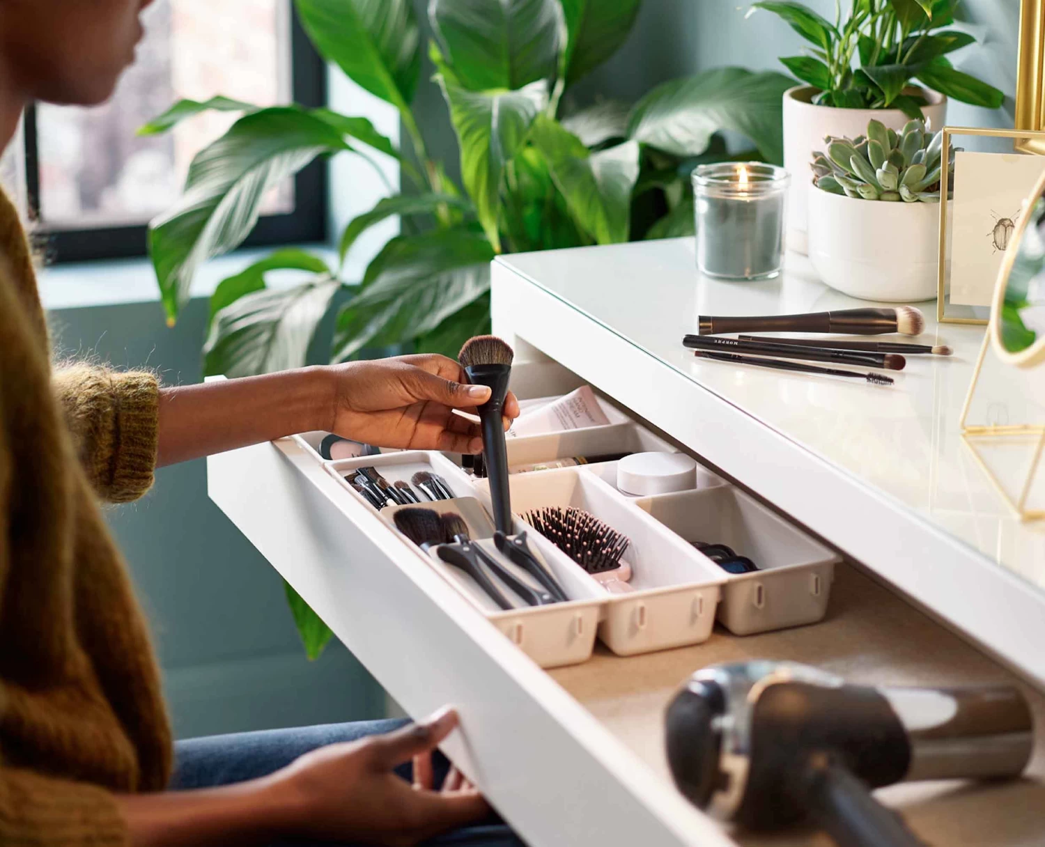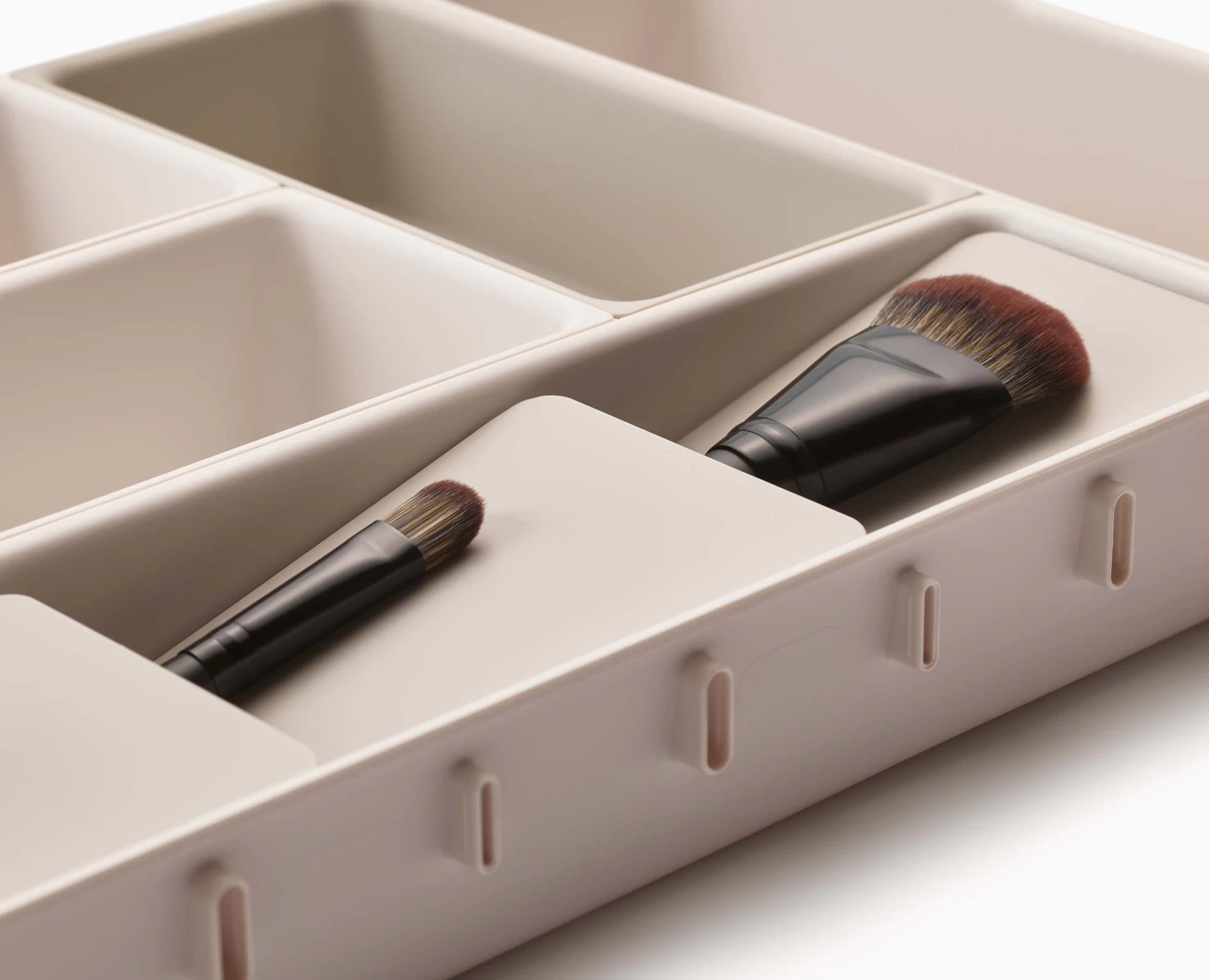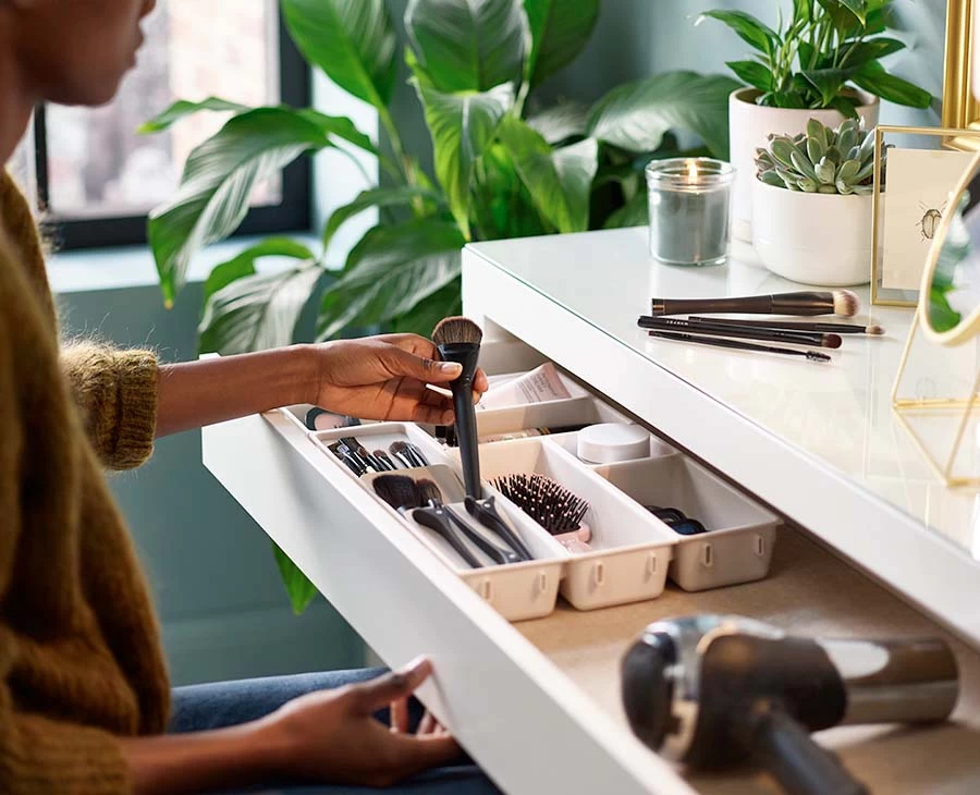 This makeup drawer organiser set has individual compartments that clip easily together and can be customised to fit any drawer space.