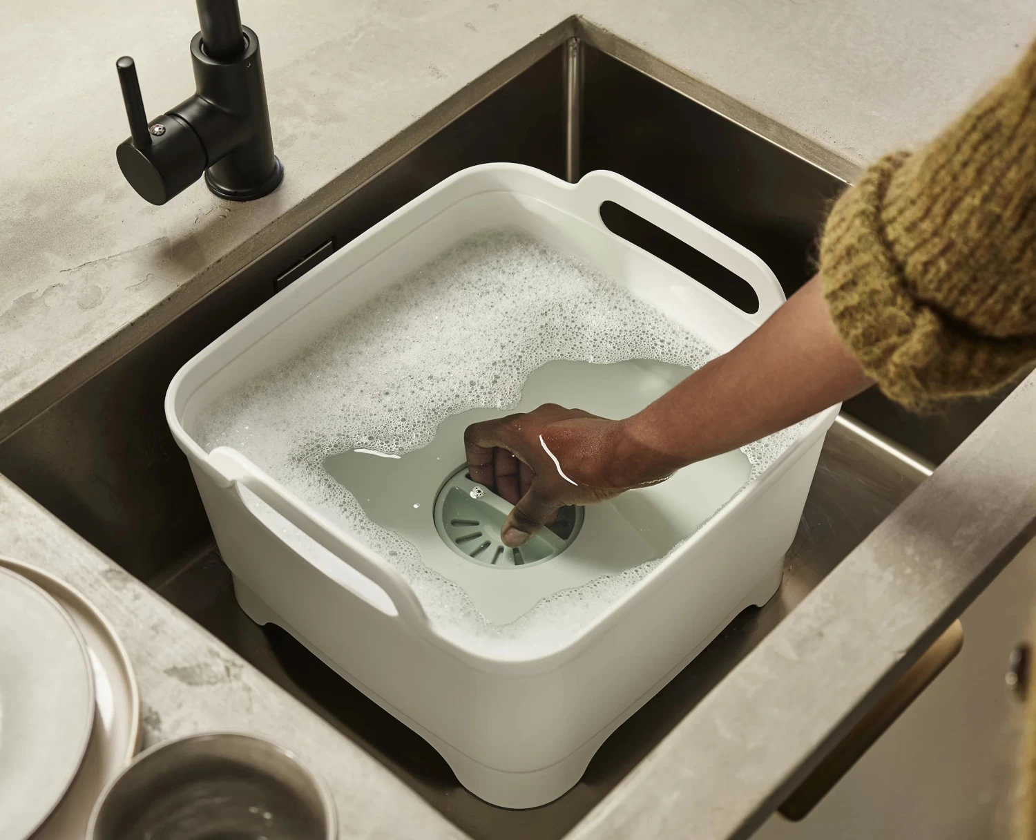 - Strain setting catches large food particles, helping to prevent sink blockages